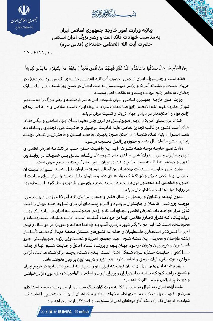 بیانیه وزرات امور خارجه جمهوری اسلامی ایران به مناسبت شهادت قائد امت و رهبر بزرگ ایران اسلامی، حضرت آیتالله العظمی خامنهای (قدس سره الشریف) به شرح زیر است: